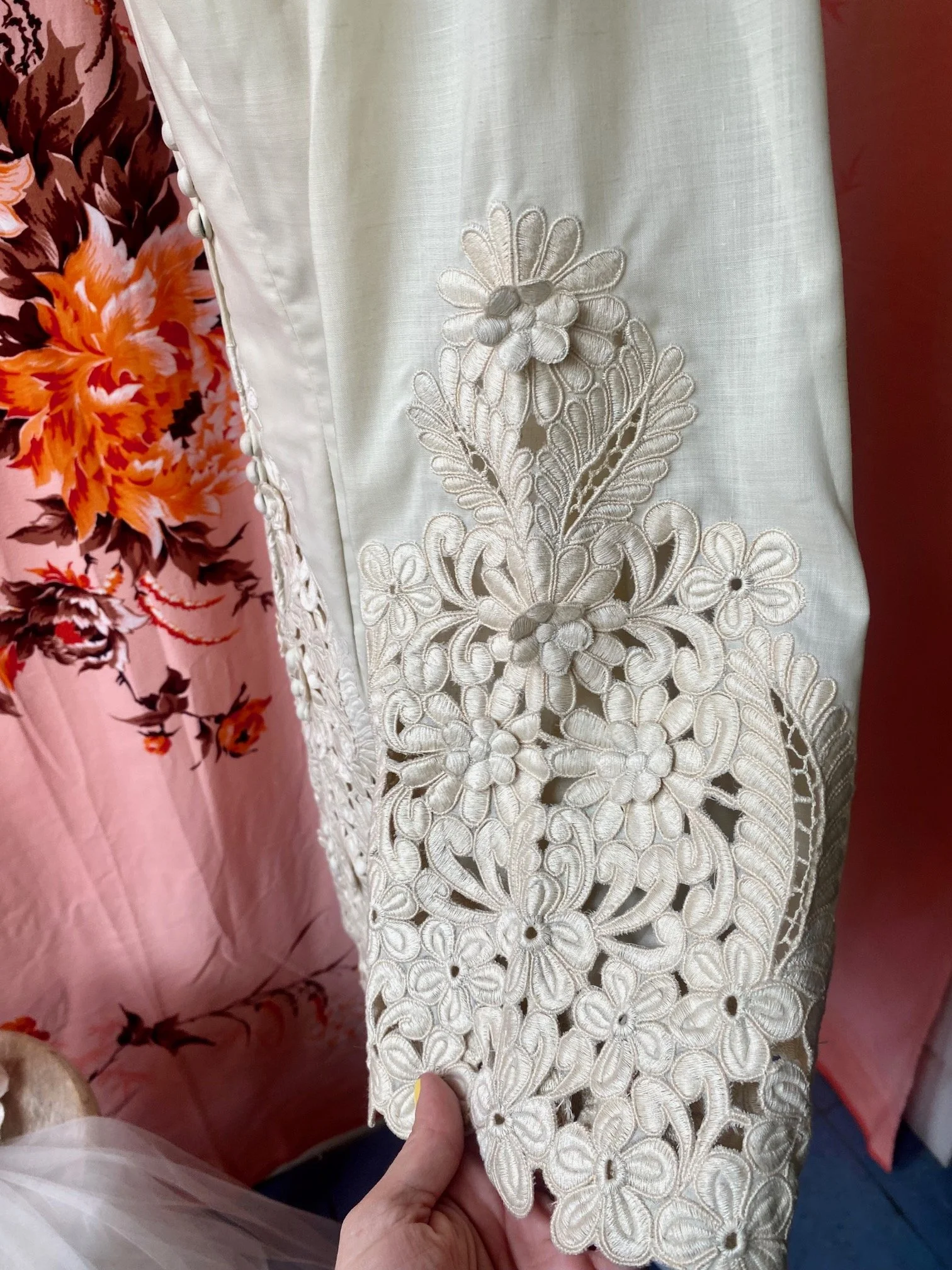 AMAZING 1970s cream mini dress with heavily embroidered hem and sleeves. With stunning 3D floral appliques, bell sleeves, and fabric covered buttons up the front, this dress could be Zimmerman or Prada. Perfect for the courthouse, rehearsal dinner, or bridal shower. Measurements: Waist 32”, Bust 34”, Hip 40”, Sleeve 22”.